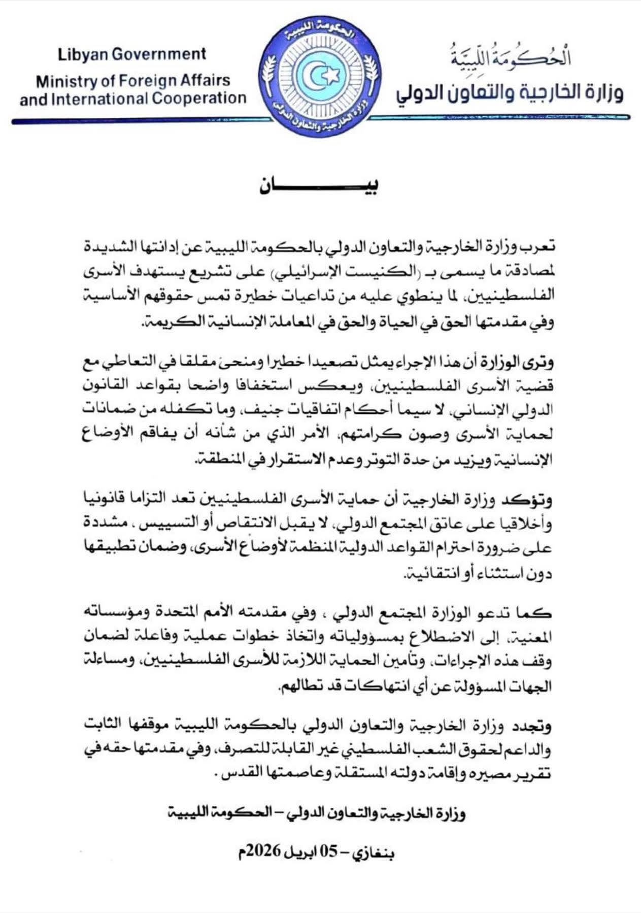 تمثل وزارة الخارجية والتعاون الدولي منذ إنشائها مقومات المجتمع الليبي ونافذته على العالم الآخر، التي تؤكد على قيم الإخاء الإنساني، وتدعو دائما إلى رفع المعاناة عن الإنسان بصرف النظر عن جنسه أو دينه، مشددة على ضرورة تعميق قيم السلام العالمي وحل النزاعات بالطرق السلمية وعبر الحوار .